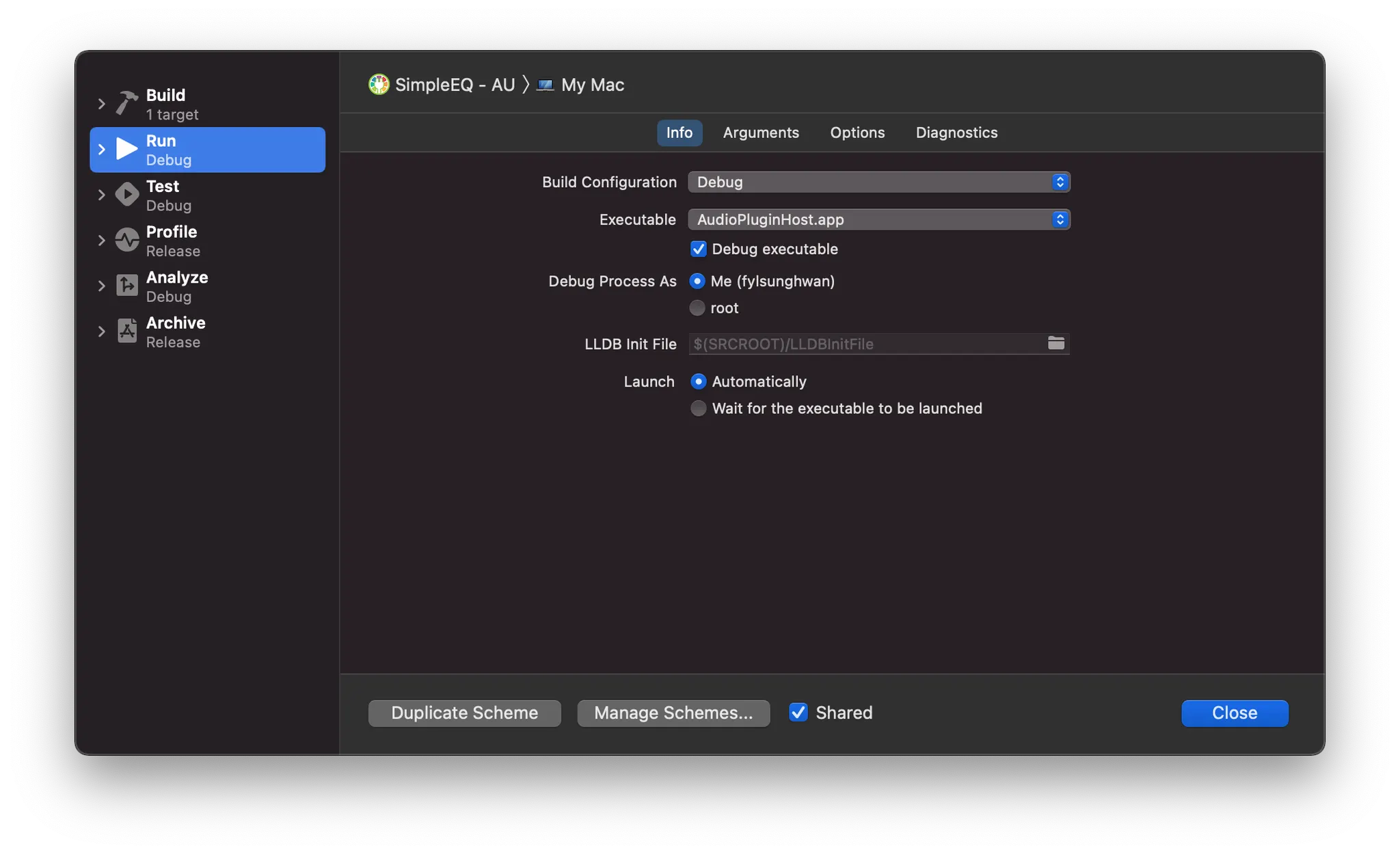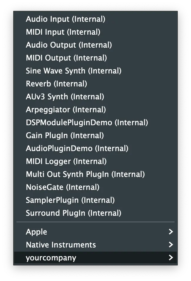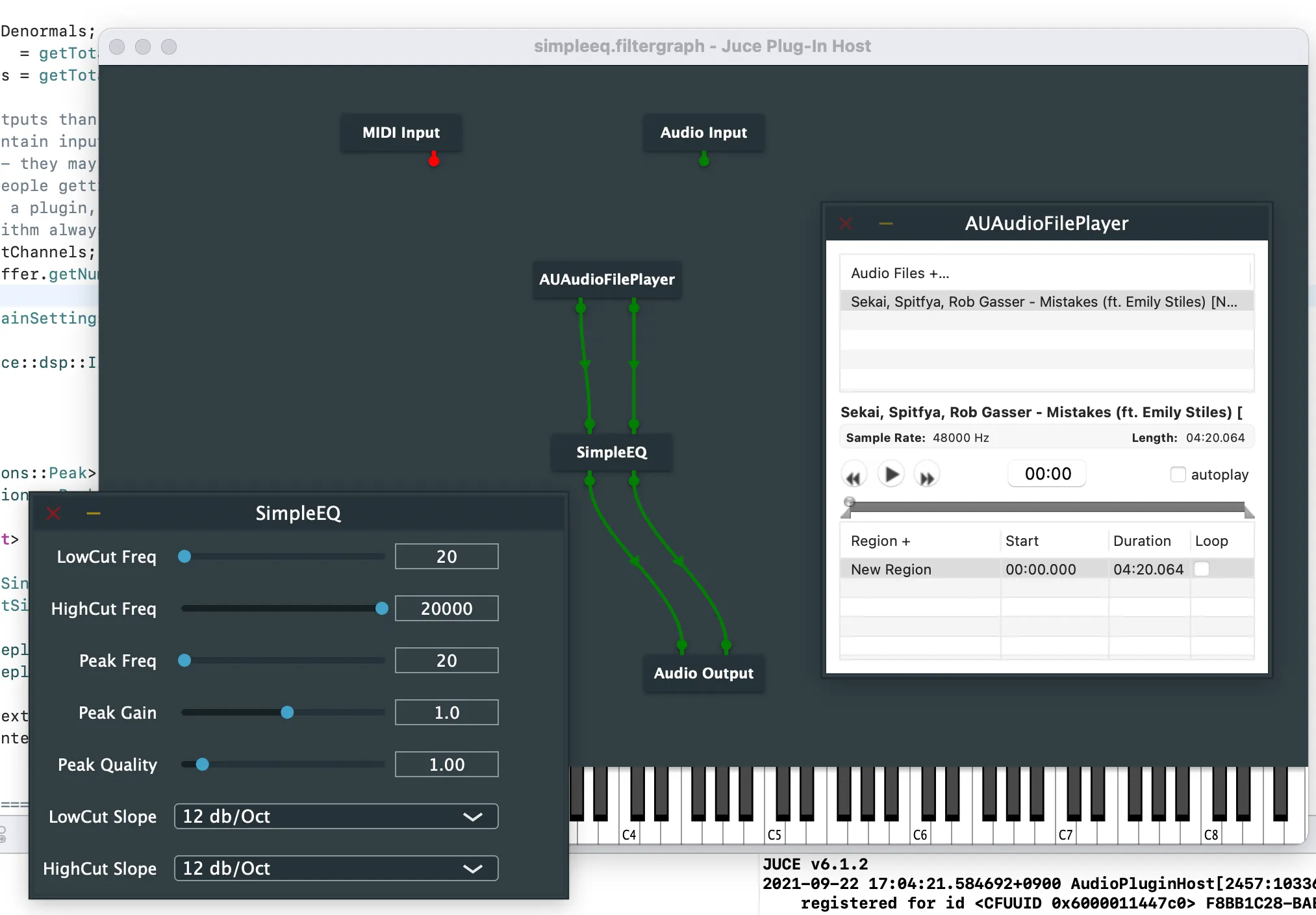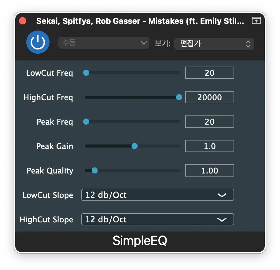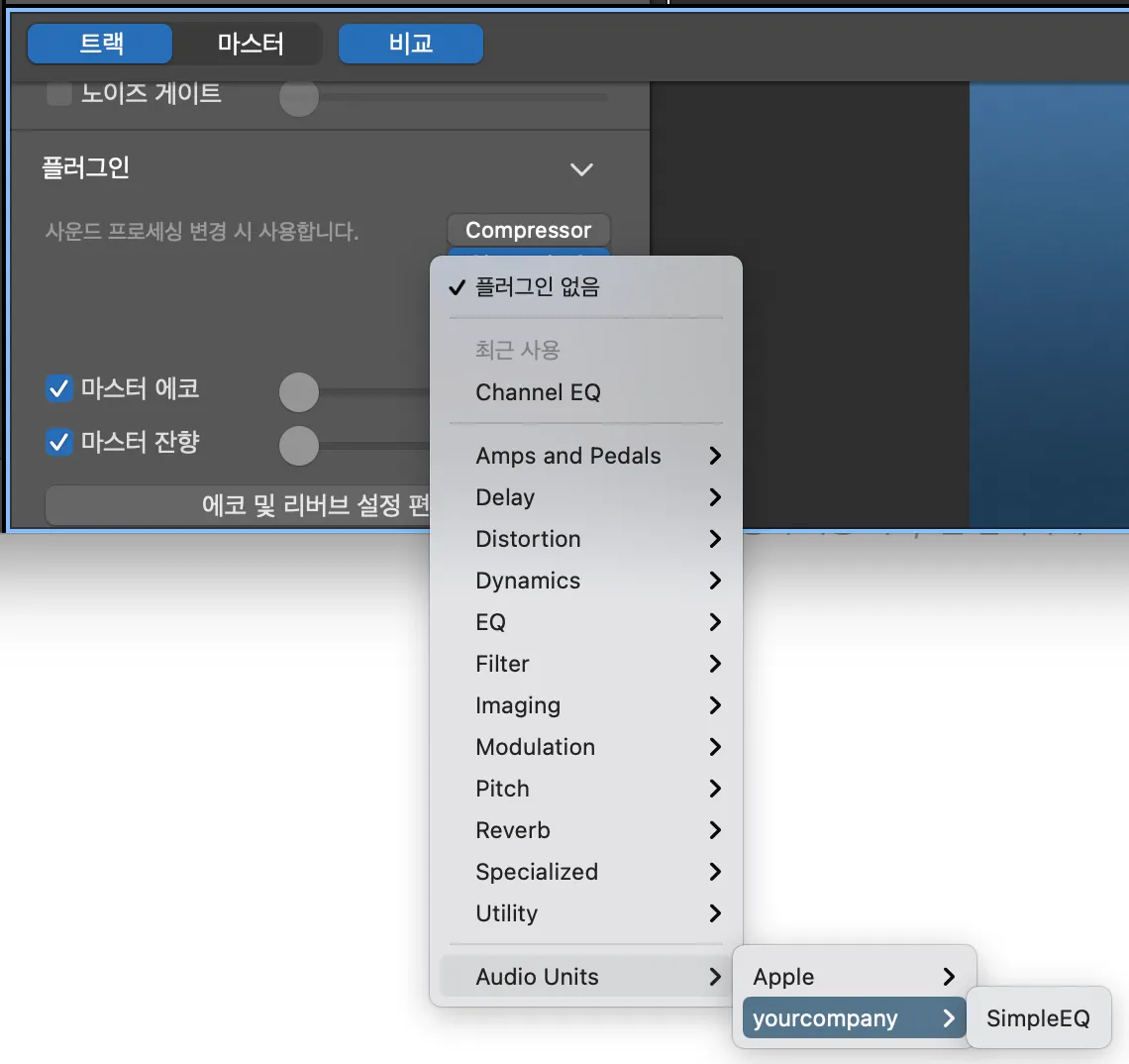 아래쪽에 플러그인 → Audio Units → yourcompany → SimpleEQ를 선택합니다.