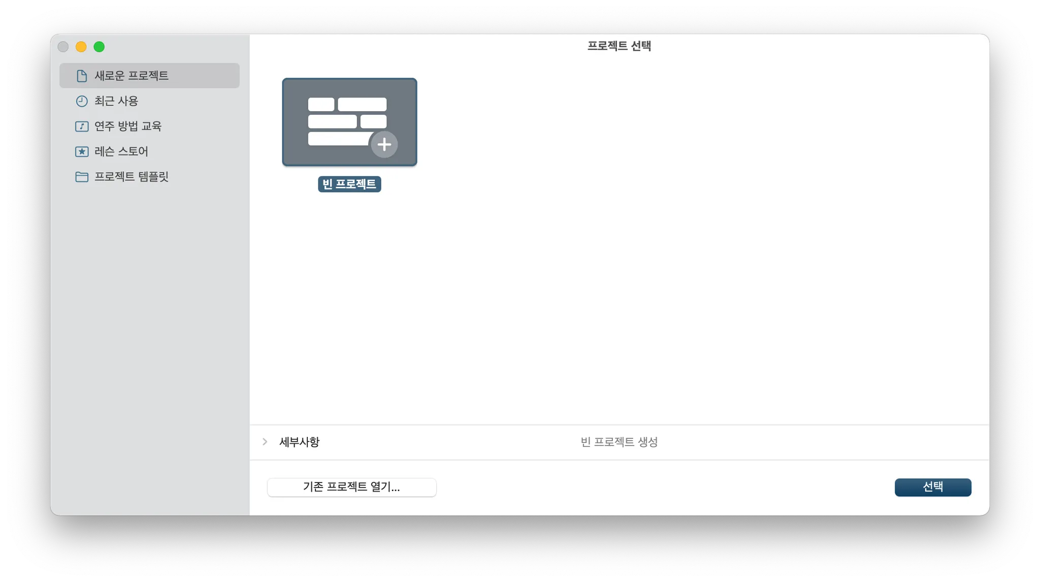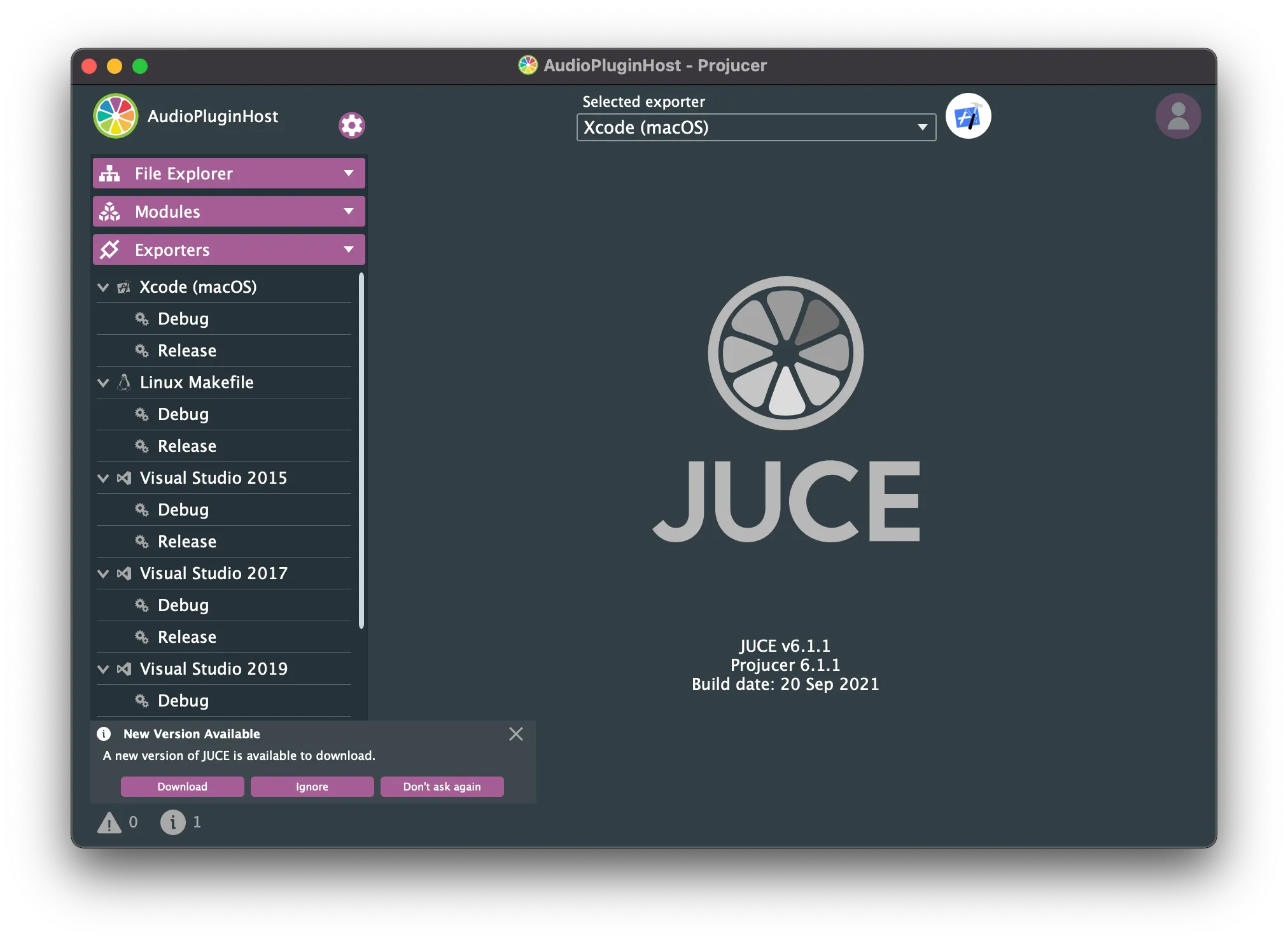 JUCE Framework 안에 있는 Projucer는 JUCE Framework를 활용한 프로젝트를 만들어주는 역할을 합니다. JUCE/extras/Projucer/Builds/<YOUR_PLATFORM>에서 해당하는 플랫폼의 프로젝트를 열어줍니다. 필자는 MacOS를 사용중이기 때문에, MacOSX폴더의 xcodeproj 파일을 열겠습니다.