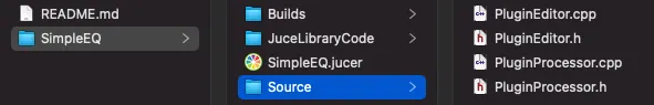 이 예제에서는 SimpleEQ라는 이름의 프로젝트를 만들어서, SimpleEQAudioProcessor라는 클래스가 만들어진 것을 확인할 수 있습니다. 이 AudioProcessor에 우리가 윈하는 오디오처리를 구현해야 한다고 볼 수 있습니다.