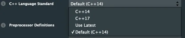 C++17를 사용할 것이기 떄문에, JUCE에서 설정버튼을 누른 후, C++ Language Standard를 C++17로 설정해줍니다.