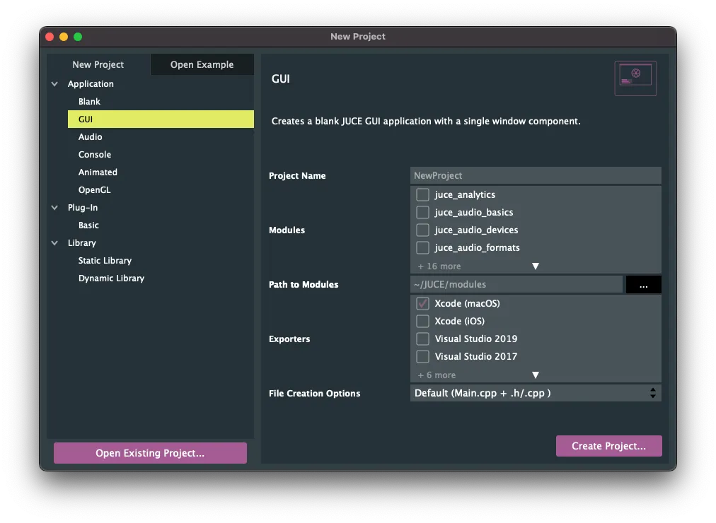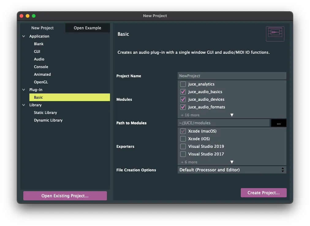 JUCE App에서 New Project를 선택 후, Plugin/Basic를 선택해줍니다. Project Name를 윈하는대로 설정해주고, Create Project를 눌러 프로젝트를 생성해줍니다.
