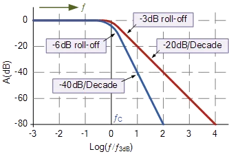 이제 LowCut, HighCut Filter를 구현하려 합니다. 앞서 언급된 바 LowCut과 HighCut Filter에는 4가지(12, 24, 36, 48db/Oct)의 Slope를 가지고 있습니다. Cut Filter에서 Slope는 아래 그래포와 같이 Cut-off Frequency에서 꺾어지는 그래프의 기울기를 말합니다.