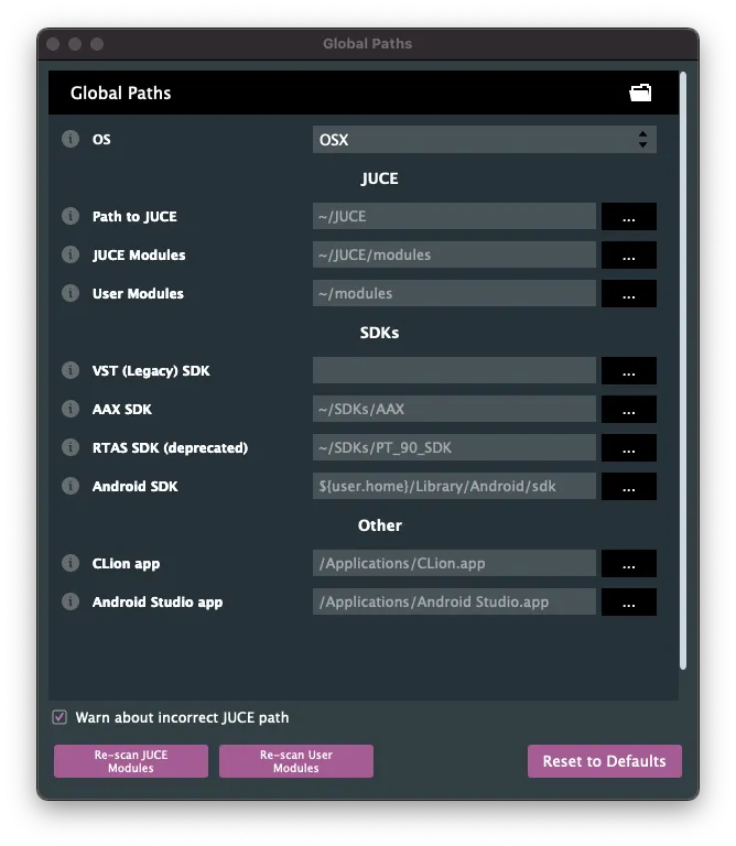 이 창이 보이면, 메뉴바에서 Projucer/Global Path를 알맞게 수정해줍니다. (git clone 후 실행했다면 자동으로 설정되어 있습니다.)