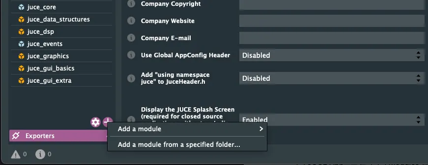 다시 JUCE App으로 돌아와서 Modules 탭에서 아래에 있는 + 버튼을 누릅니다. 그 후, Add a module/Global~/juce_dsp를 선택하여 Juce DSP를 추가해줍니다.