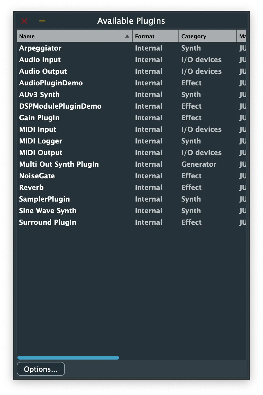 Float값이 아닌, 파라미터를 선택할 수 있는 형태로 만들고 싶다면 AudioParameterChoice를 사용할 수 있습니다. StringArray형태의 선택지들을 만든 후, 이를 AudioParameterChoice에 넘겨줍니다.